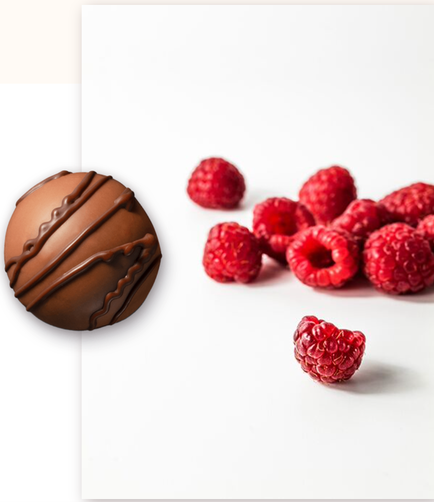 Ganache à la framboise, enrobée de chocolat au lait. Décoration en chocolat noir.