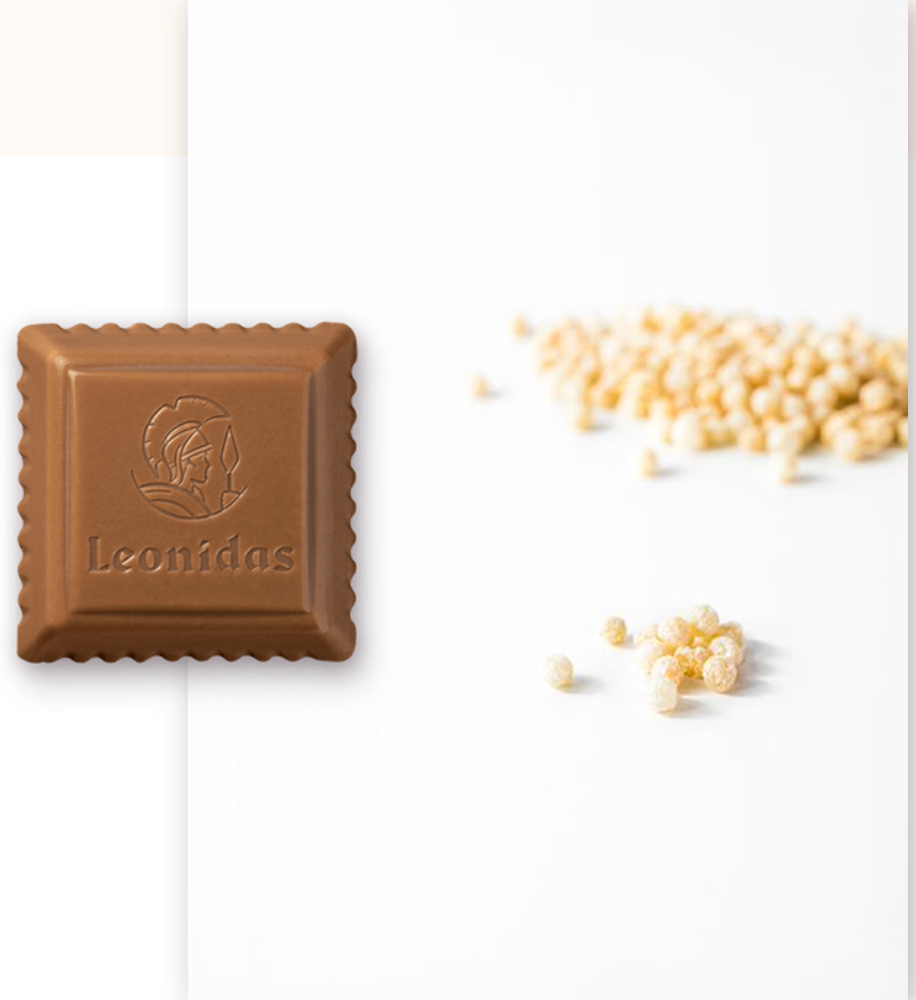 Sous un enrobage de chocolat au lait Leonidas, le riz soufflé éclate au coeur du praliné moelleux, mariant le fondant du chocolat et le croustillant du riz soufflé.