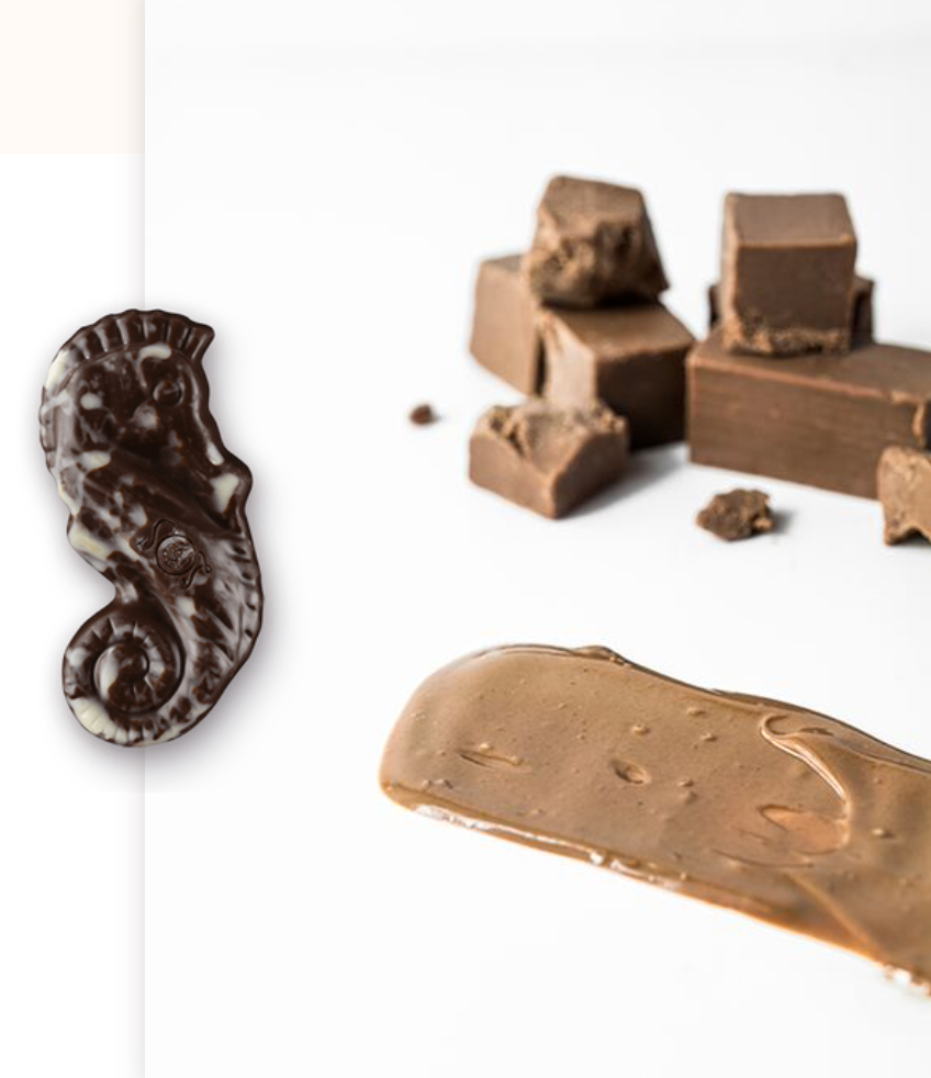 À la pêche aux trésors. Ce chocolat noir Leonidas marbré de blanc, en forme d'hippocampe, de crevette, de tourelle ou de moule, fourré d'un praliné saveur caramel, invite à la pêche aux délices chocolatés. La robe corsée recèle un coeur moelleux et fondant.